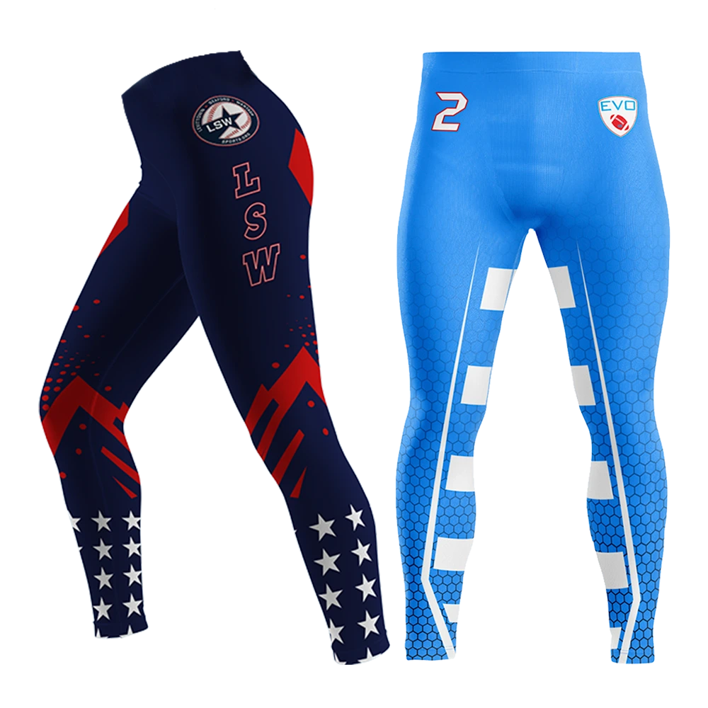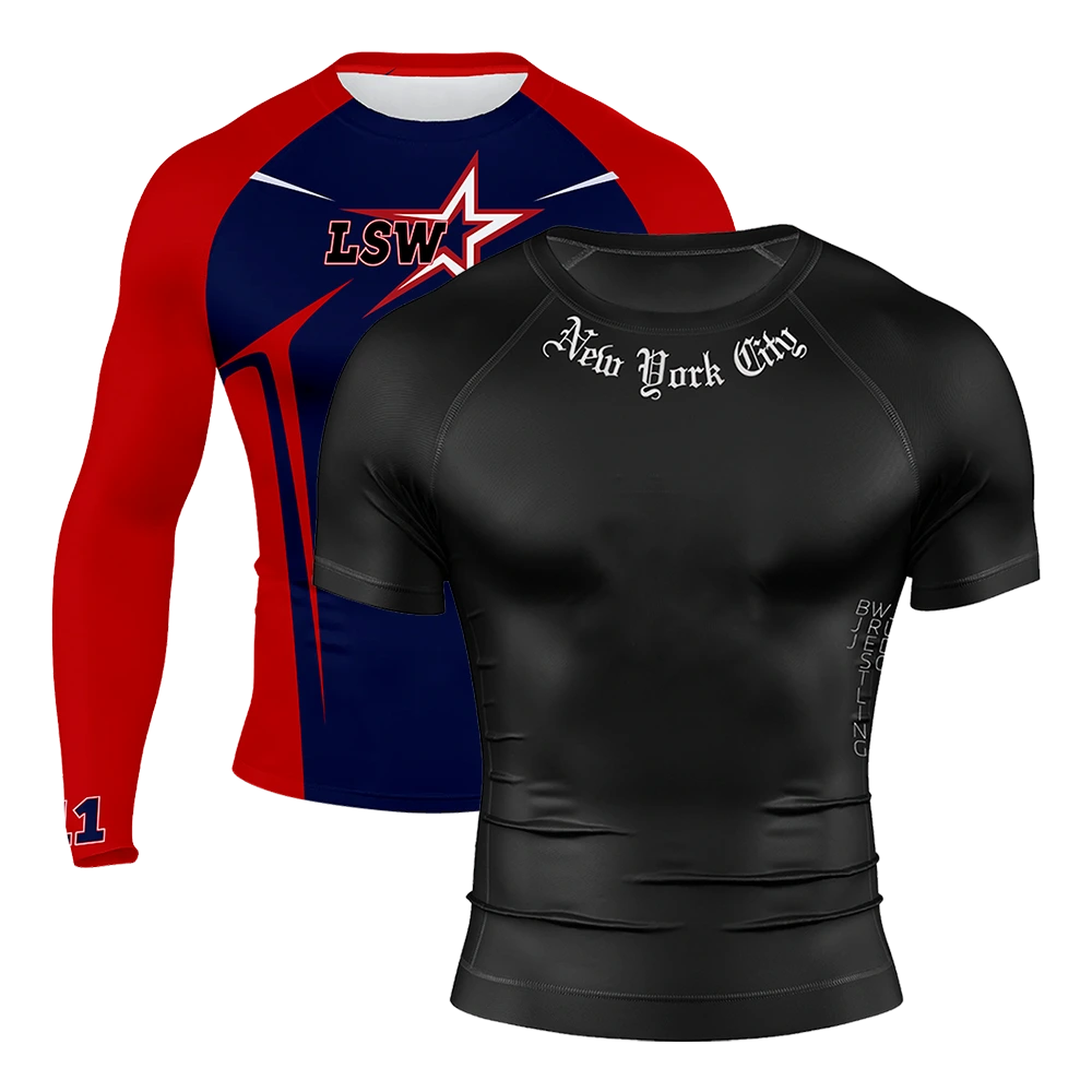 Long-sleeve and short-sleeve compression shirts are available. Just like all our other merchandise, nearly every inch of the fabric can be customized to your exact specifications